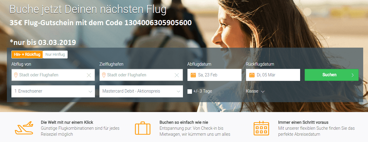 Dort erhält Ihr zeitlich begrenzt einen 35€ Gutschein (mit dem Code 1304006305905600), den Ihr für Euren Flug einsetzen könnt.